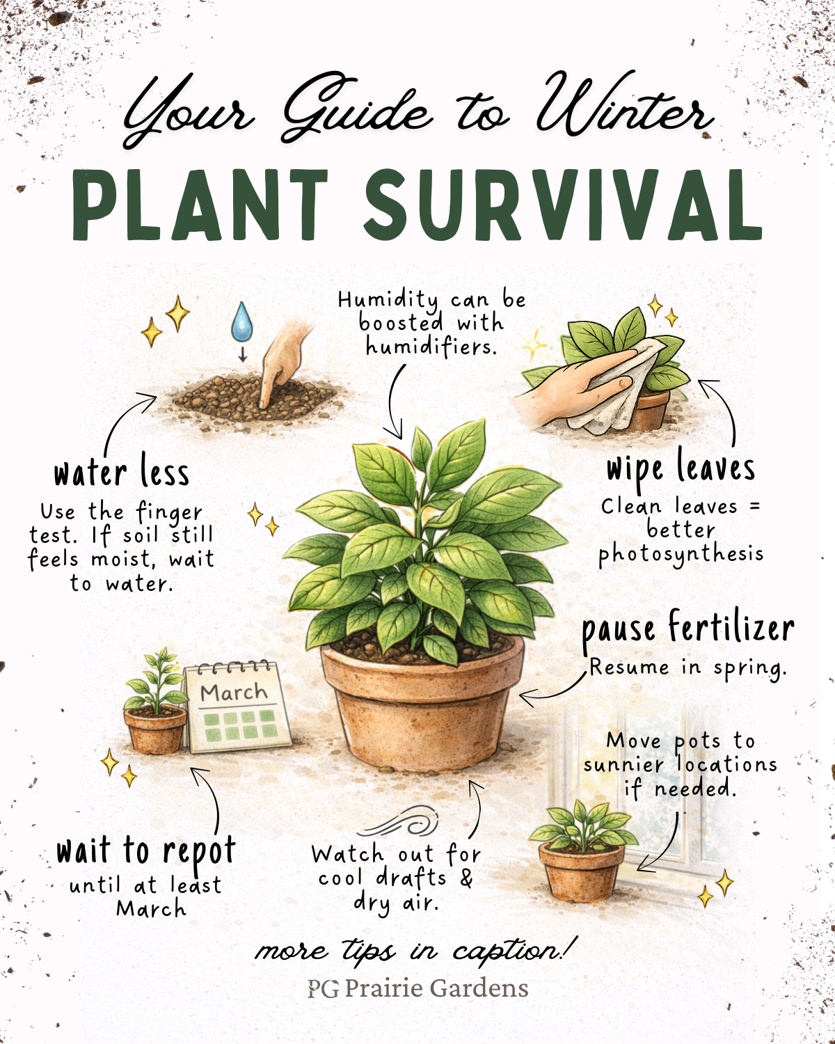 Winter is all about maintenance, not big changes. Skip repotting, heavy pruning, or anything drastic. Focus on keeping plants stable and stress-free.